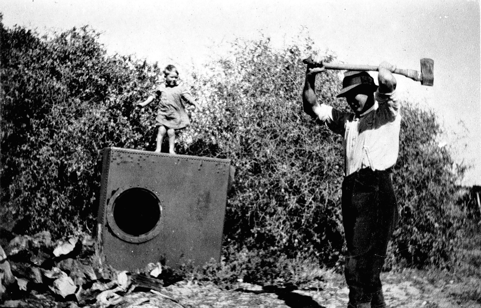 A man chopping wood. A small child stands on a water tank in the back- ground.