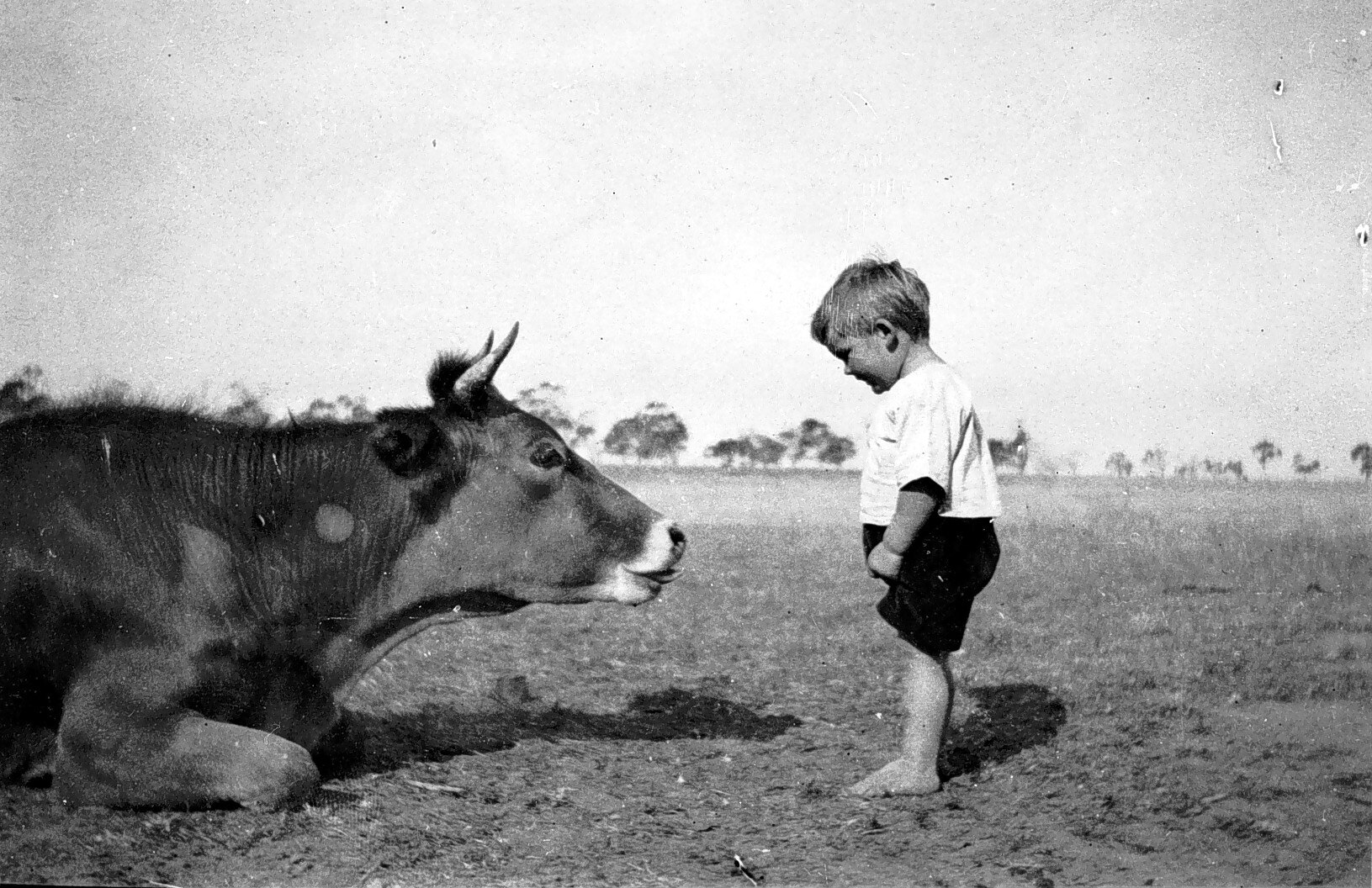 A small boy looking at a cow.