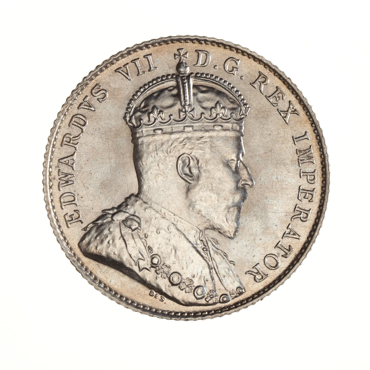 Crowned and draped bust of the King facing right; around, EDWARDVS VII D. G. REX IMPERATOR; the artist's initials, DES, in field below bust