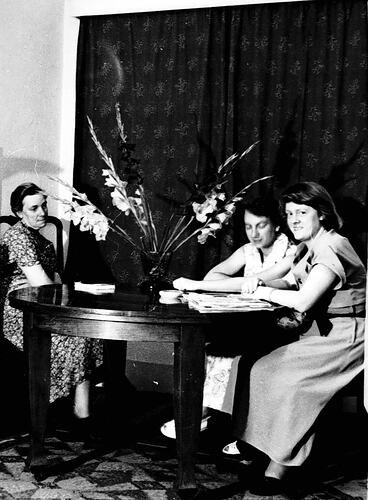 Three women seated at a table. There is a vase of gladioli flowers on the table and a curtain over the window behind them.
