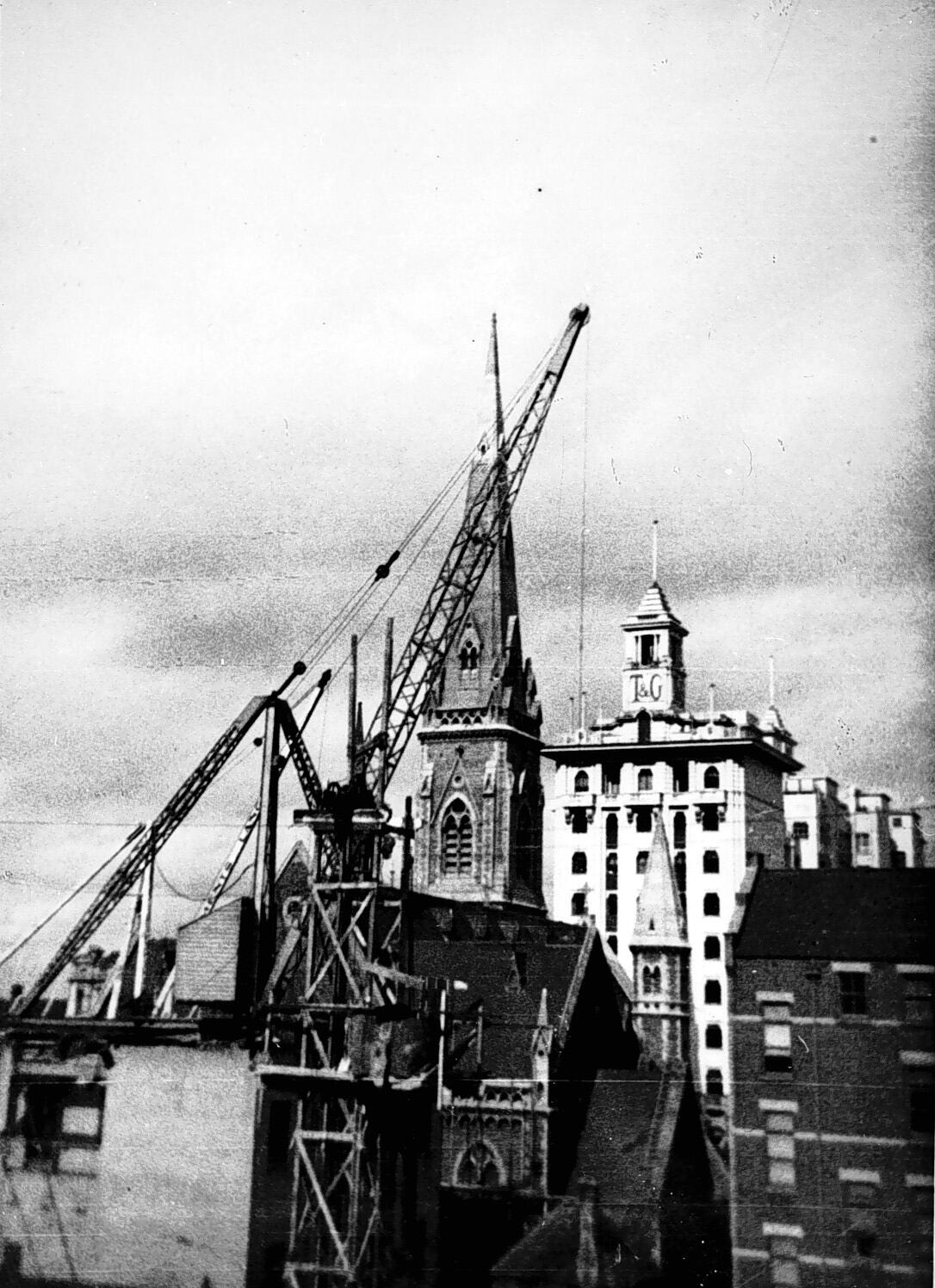 Construction work on Scots Church. There is a crane on the left and the T & G Building is in the background.