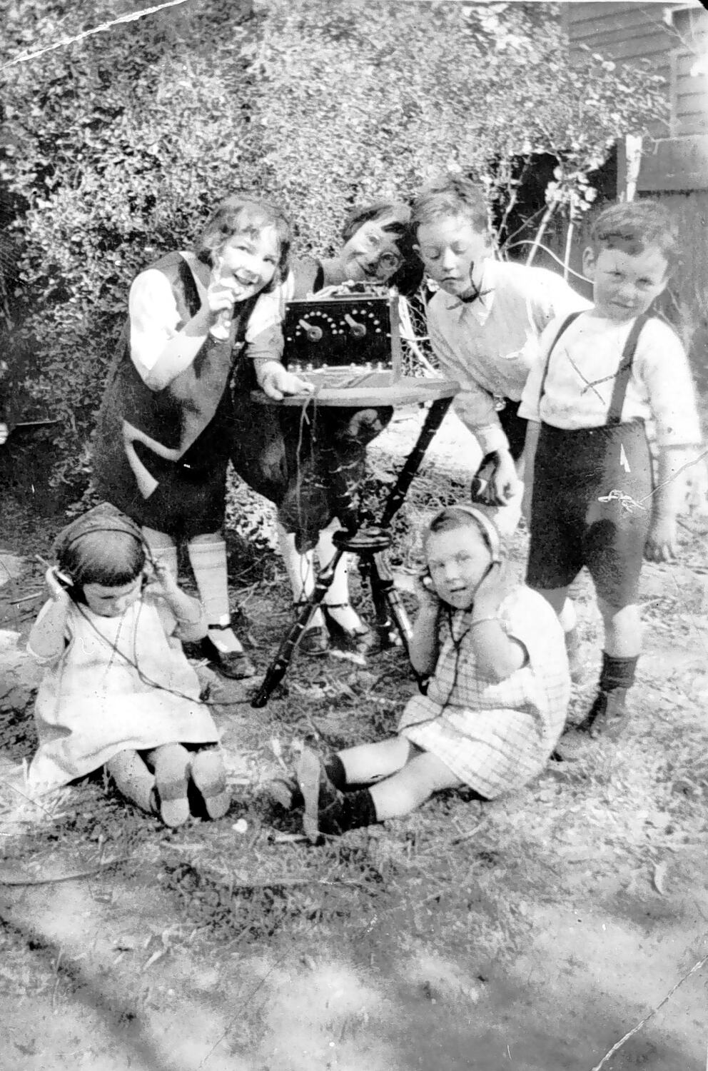 A group of children listening to a crystal radio.