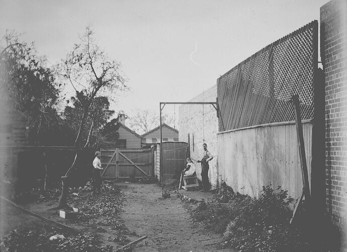 George, Lawrence & Kathleen Beckett in the backyard of the Beckett family home at 180 High Street, Northcote, circa 1904. Photograph by Thomas Beckett.