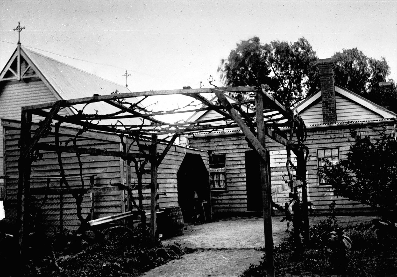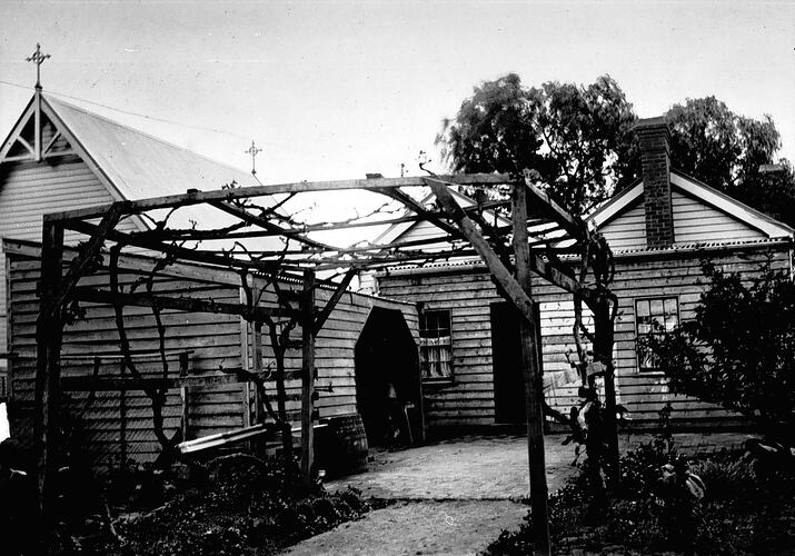 The rear and yard of a residence adjacent to a church. The buildings are weatherboard with brick chimneys. Crosses on roof finials of church. There is a vine on a pergola in the foreground.