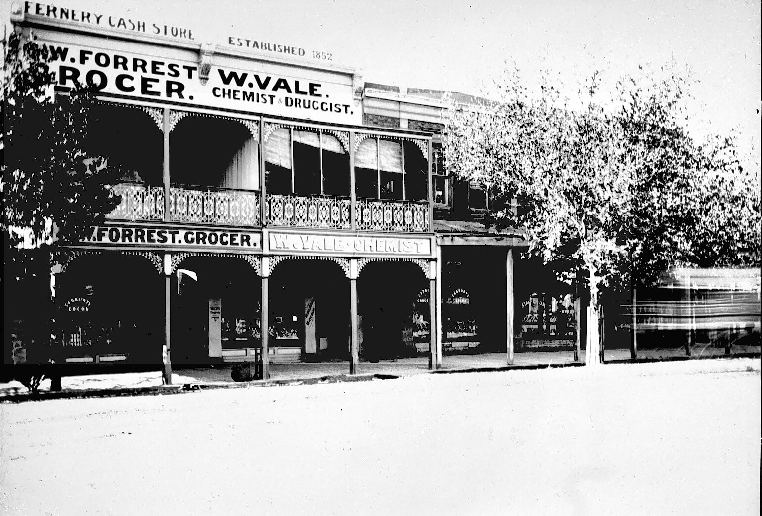 A street in Bendigo. Shops include: W. Vale, Chemist & Druggist, H. (Harry) Forrest, Grocer.