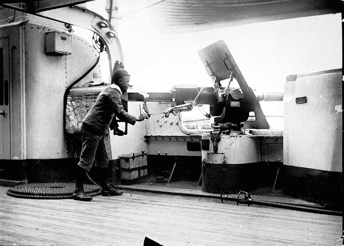 George Beckett pretending to fire the quick firing gun aboard the HMS Royal Arthur, during its visit to Port Melbourne, 3 November 1898.