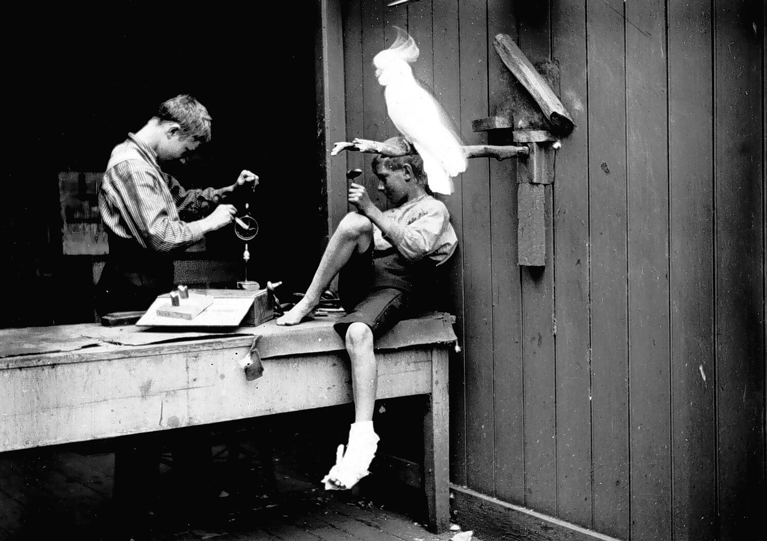 Two boys woodworking. One is using a hand held drill. There is a large cockatoo on a perch behind them. This photograph was taken in the backyward of the Beckett residence, 'Alma', High Street, Northcote, Melbourne.
