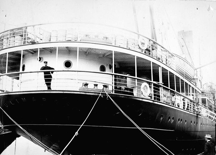 View of stern of SS Ulimaroa at pier at Port Melbourne, 27 April 1910. Photograph taken by Thomas Beckett.