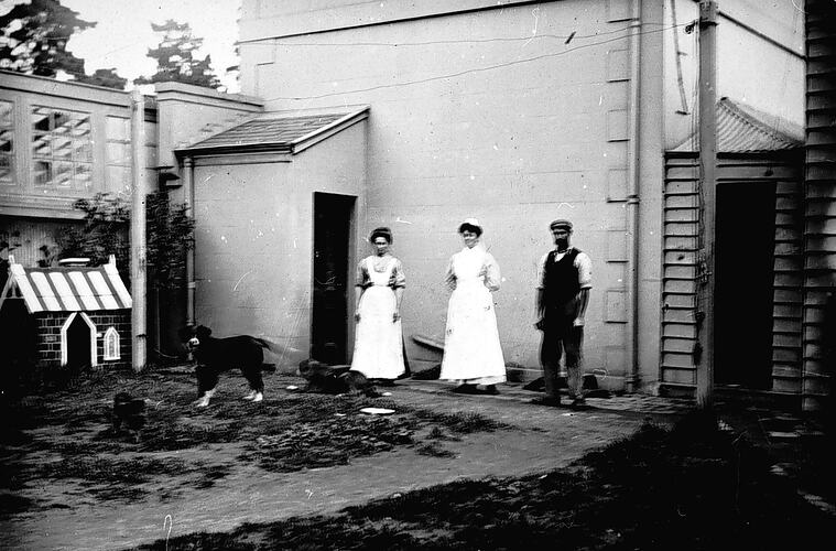 A man and two women, they were the domestic staff at 'Chelmer'. There is a dog and a kennel on the left (see also MM 008145).