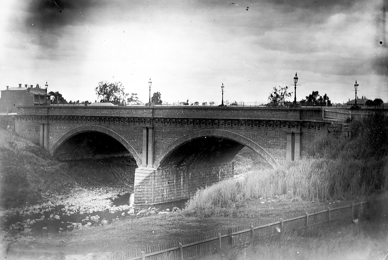 West side view of the brick and bluestone masonry arch bridge which carries High Street over the Merri Creek between Clifton Hill and Northcote. The bridge design comprises two 20 metre segmented arch spans built in English bond brickwork, supported on a central pier of quarry-faced bluestone ashlar masonry with similar bluestone abutments. Above the centre pier and each abutment are coupled squared ashlar bluestone Doric pilasters. A bluestone Doric entablature with ornamental cornice brackets extends across the entire length of the bridge at the level of the road surface and is topped by brick parapet walls which curve outwards at either end to follow the wingwalls. The pilasters extend through the parapets and are capped by stone plinths providing bases for six cast iron gas lamp standards. Reticulated gas mains were first extended across Merri Creek to Northcote over the High Street Bridge following its completion in 1875. The watercourse running beneath the bridge is carrying only a small flow of water and is strewn with rough basalt boulders across the creek bed. There is a wooden picket fence running along the creek bank in the foreground and a double-storied brick terrace house can be seen on the far side of the creek behind the bridge, along with the roofs of other houses.