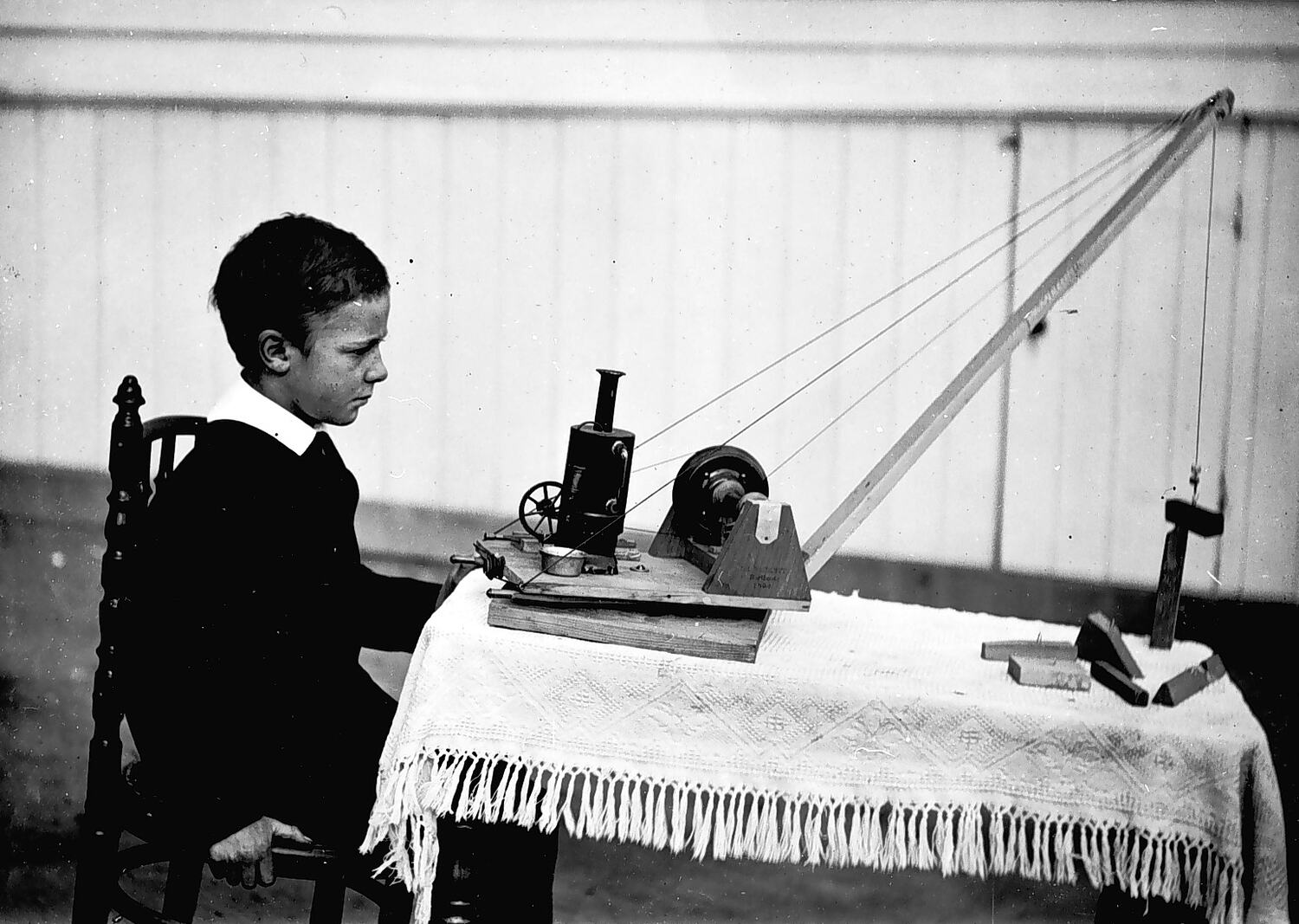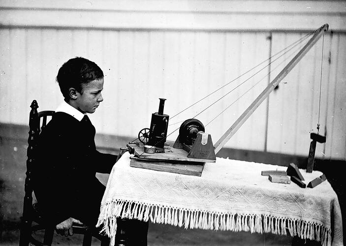 George Beckett sitting with a steam-driven toy crane in the backyard of the family residence at Westbourne Grove, Northcote, circa 1894. Photograph taken by his father Thomas Beckett.