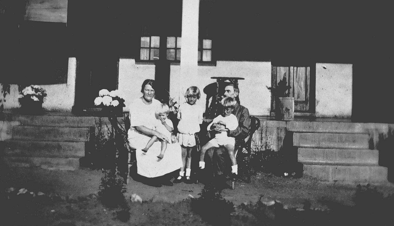 A family group sitting in front of a house. On either side of the group is a flight of steps leading up to a verandah and a doorway.