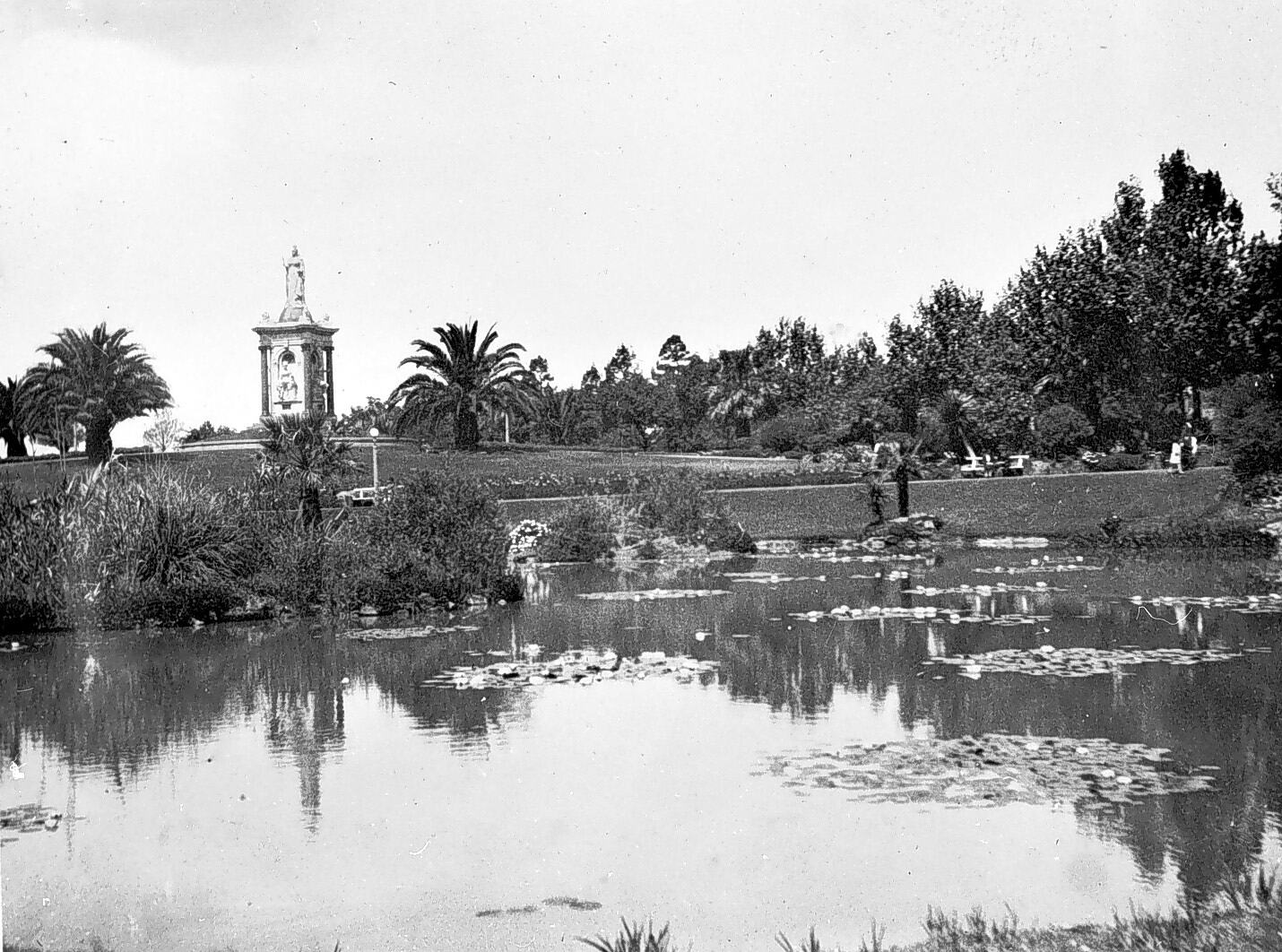 The Queen Victoria statue in the Queen Victoria Gardens. There is a lake in the foreground.