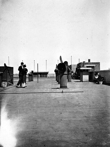 A couple dancing on the roof of Myers Store. There are a number of ventilators.