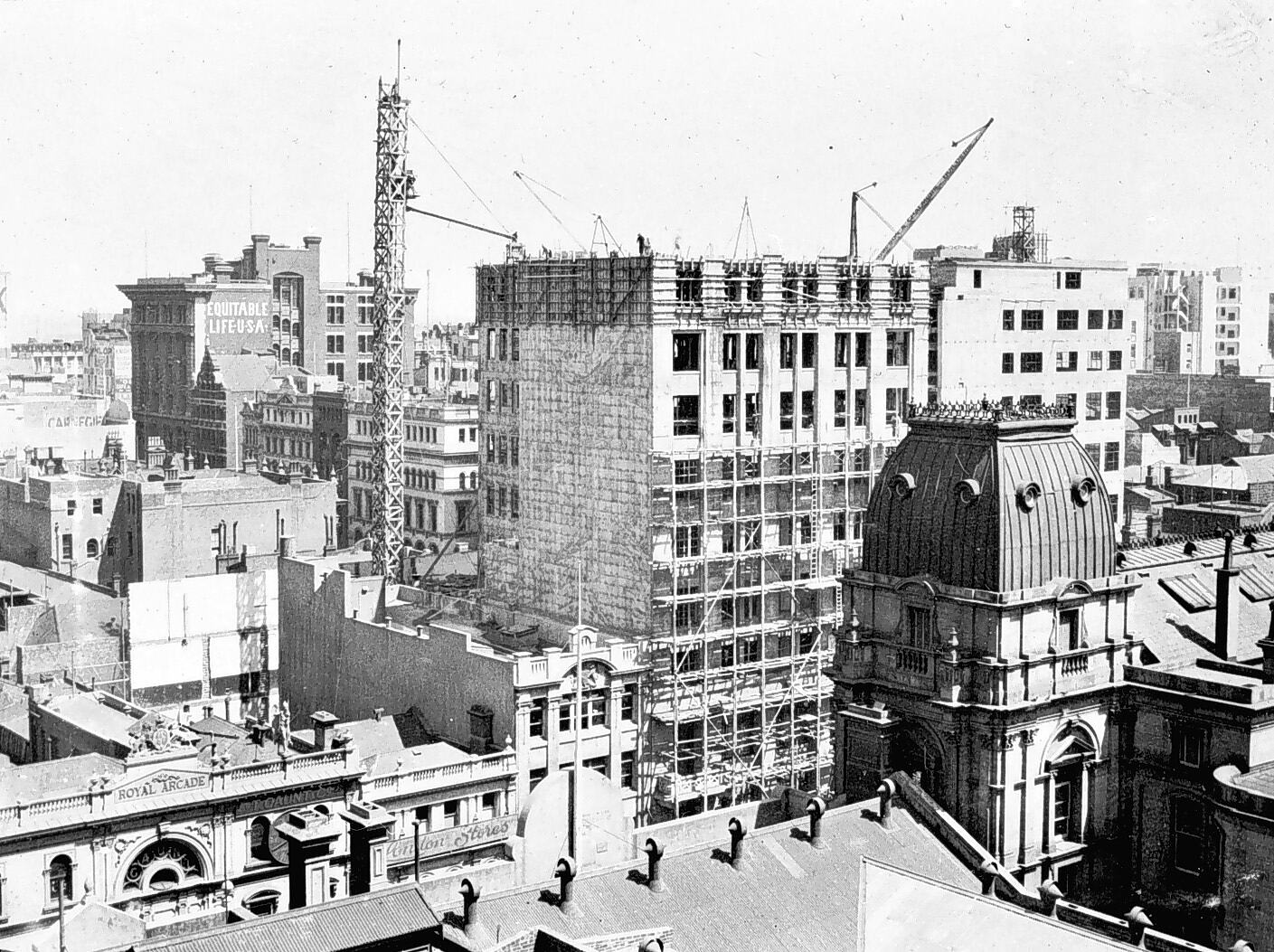 Looking south west from the roof of Myers Store. The Post Office is visible on the right, the London Stores are under construction on the other side of Bourke Street and the Royal Arcade is on the left.
