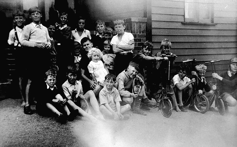 A group of boys and girls after a scooter race. They are standing in front of the owner 's entrance to the Aspendale Post Office and Store.