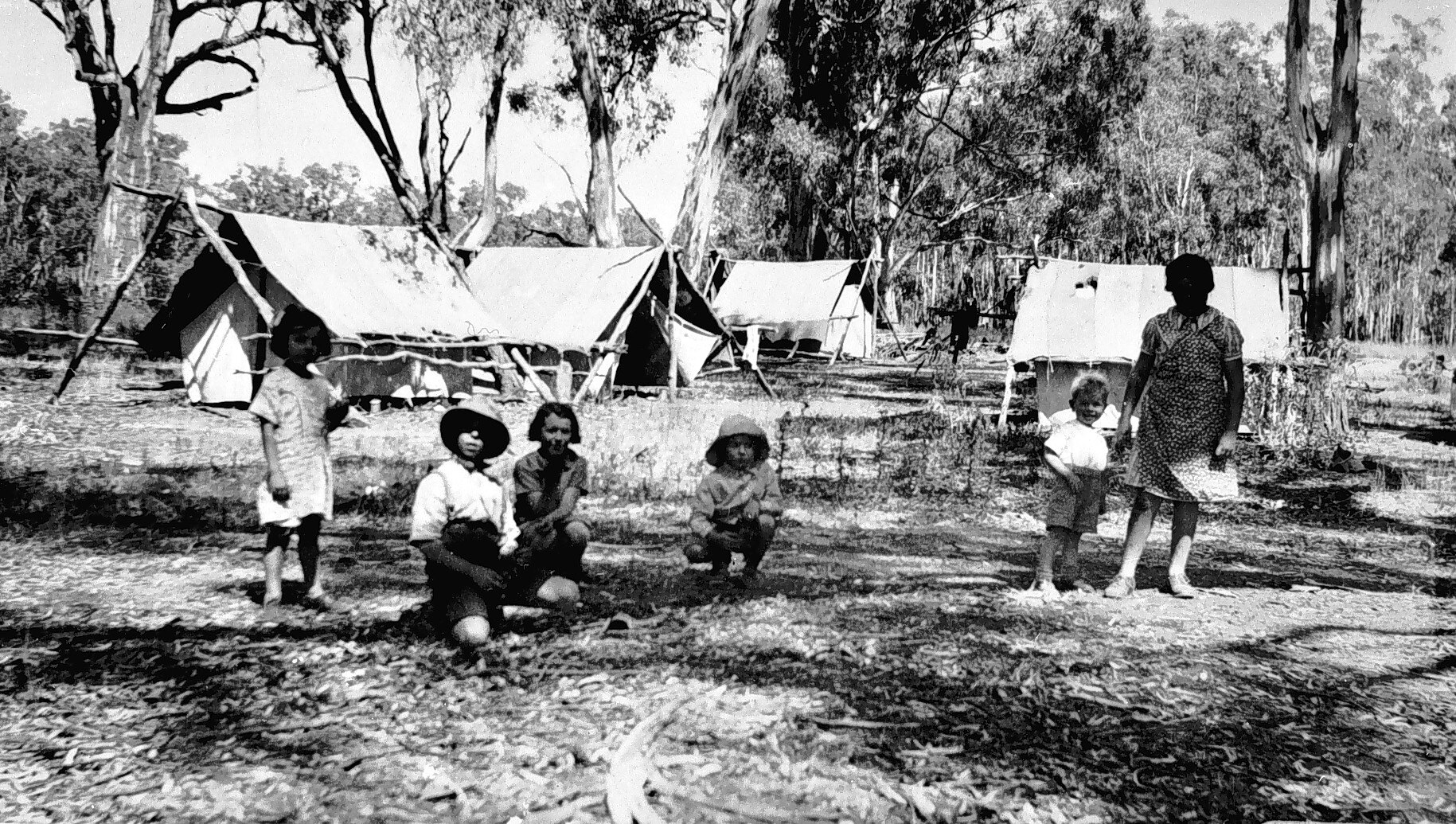 Members of the Dohnt family at a camp site in the Barmah Forest. The tents are canvas stretched over a wooden frame.