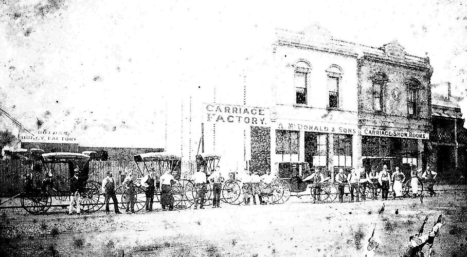 Workers with coaches in front of Alexander MacDonald 's Carriage Building. The Hotham Buggy Factory is on the left (see also MM 008392).