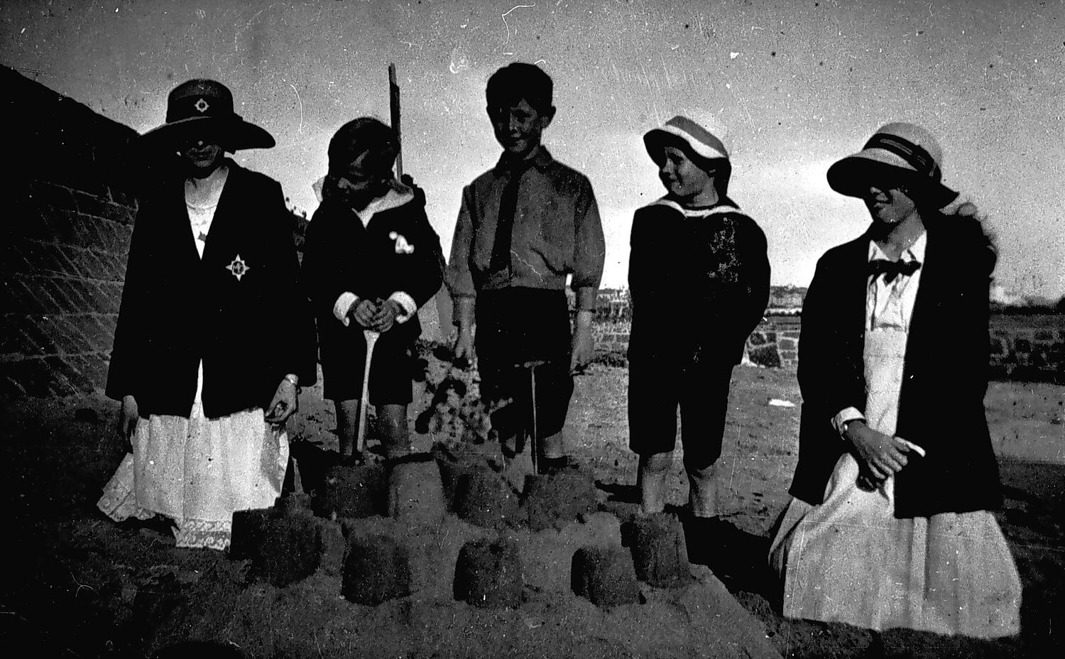 Five children on the beach with a sandcastle. The girl on the left is wearing a school hat and blazer.