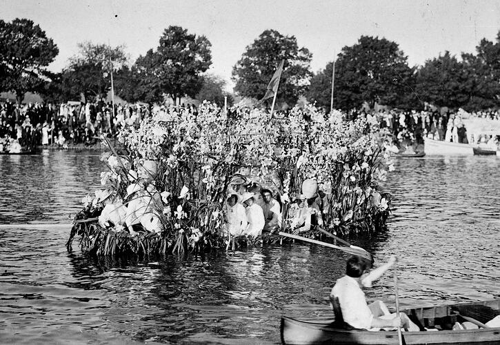 The Hart family in a decorated boat on the Yarra in 1913. They won first prize for their entry in a spectator event. The official event was the Australian Henley Regatta, first established in 1904 and one of the most important regattas on the Victorian rowing calendar. The regatta is still held annually.