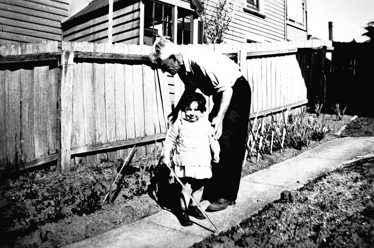A man and a small girl in a backyard.