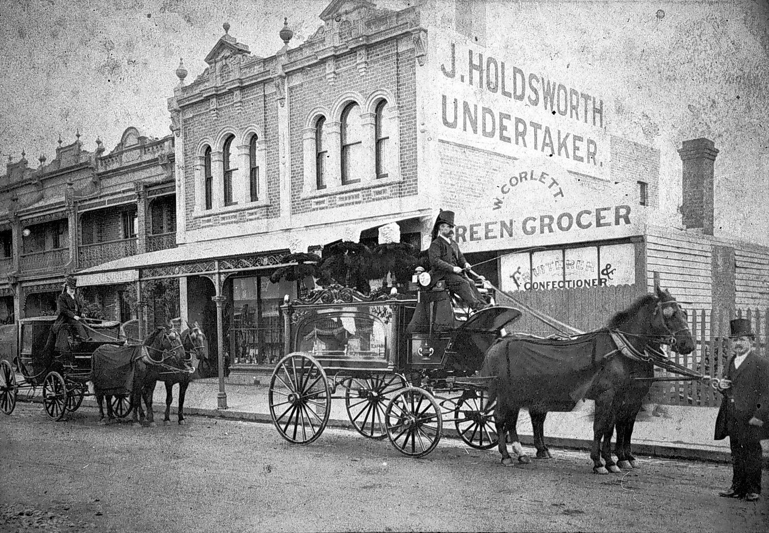 A hearse and a carriage outside the premises of J. Holdsworth, Undertaker.