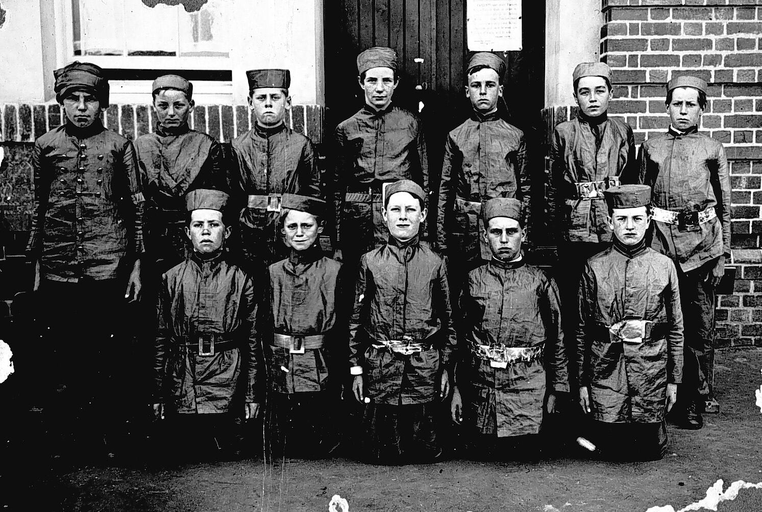A group of boys in costume for a school concert at Westgarth Primary School. They all wear tunics with wide belts and have pill box hats.