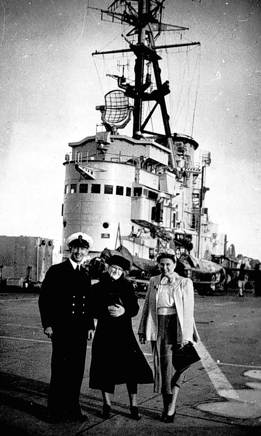 A man in naval uniform and two women standing on the deck of the aircraft carrier HMAS Sydney (previously HMS Terrible).