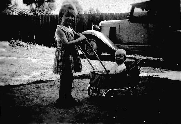 A girl with a baby boy in a doll 's pram. There is a car in the background.