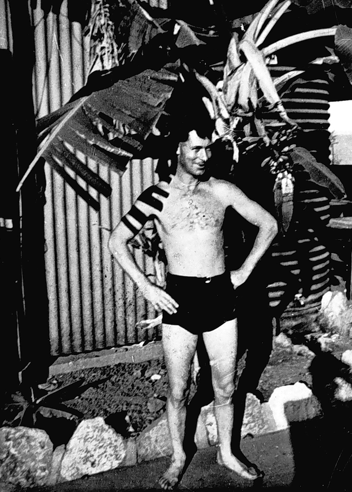 A man in swimming costume at the army camp of the Australian Army Searchlights 65th Battery. He is standing under a banana tree and there is a corrugated iron building behind him.
