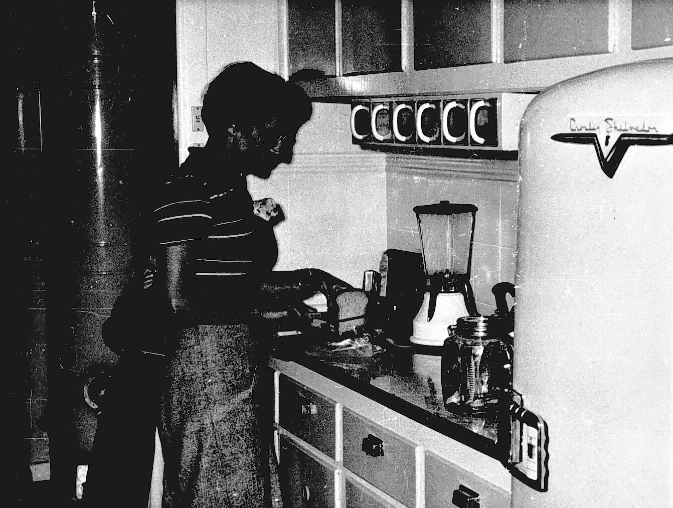 A woman in a kitchen. She is slicing a loaf of bread. There is a refrigerator on the right, a blender on the counter and a briquette hot water service in the background.
