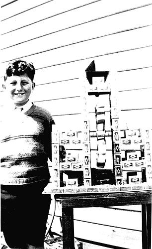 A boy with a sandwheel constructed from match boxes for a Bryant and May competition.