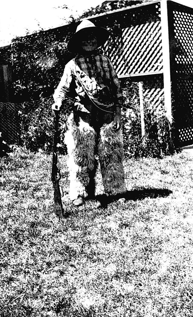 A young boy dressed as a cowboy for a scout fancy dress function. There is a trellis behind him.