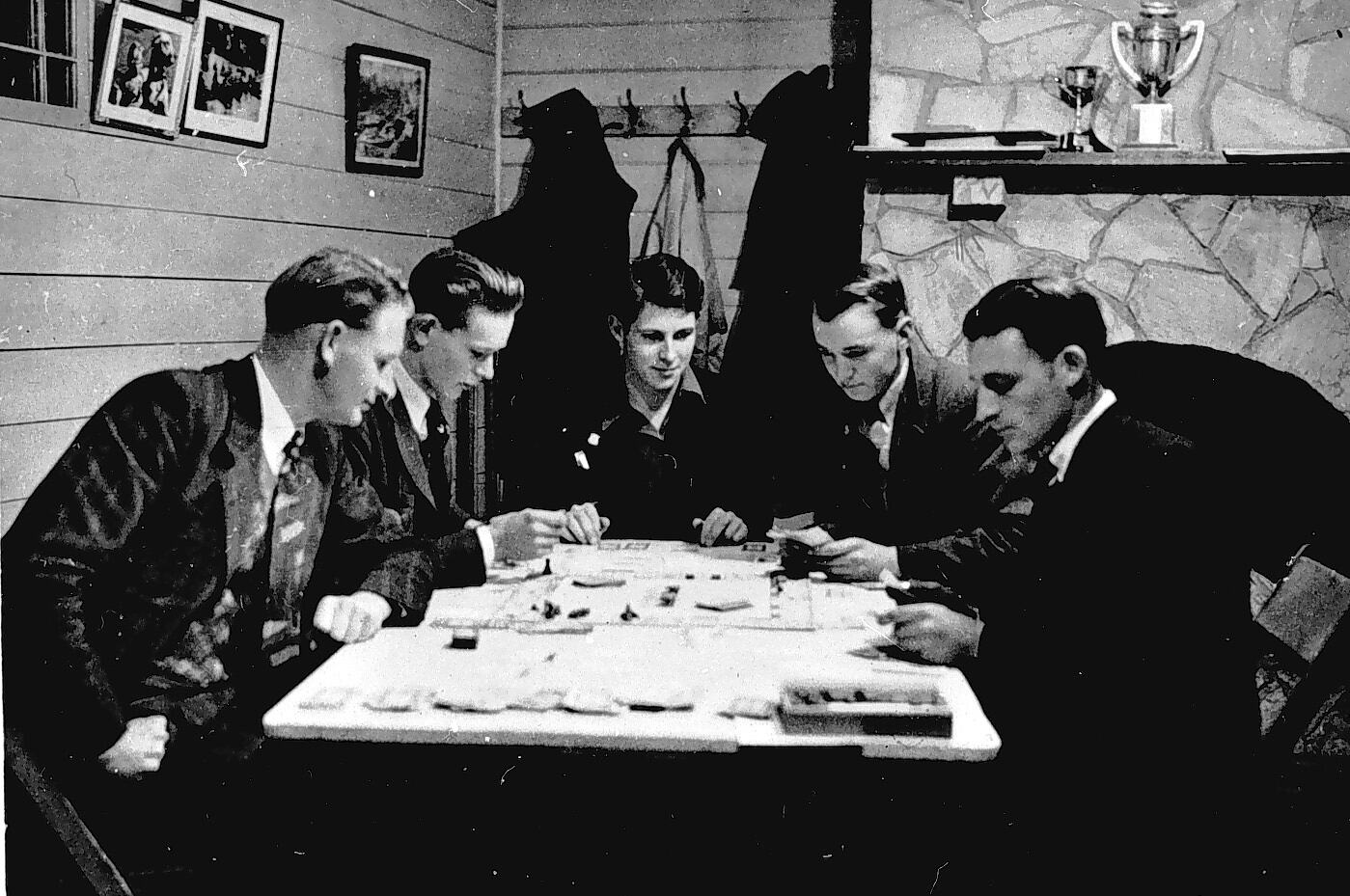 Members of the 'Rudder Grange' canoe club playing monopoly in their boat house.