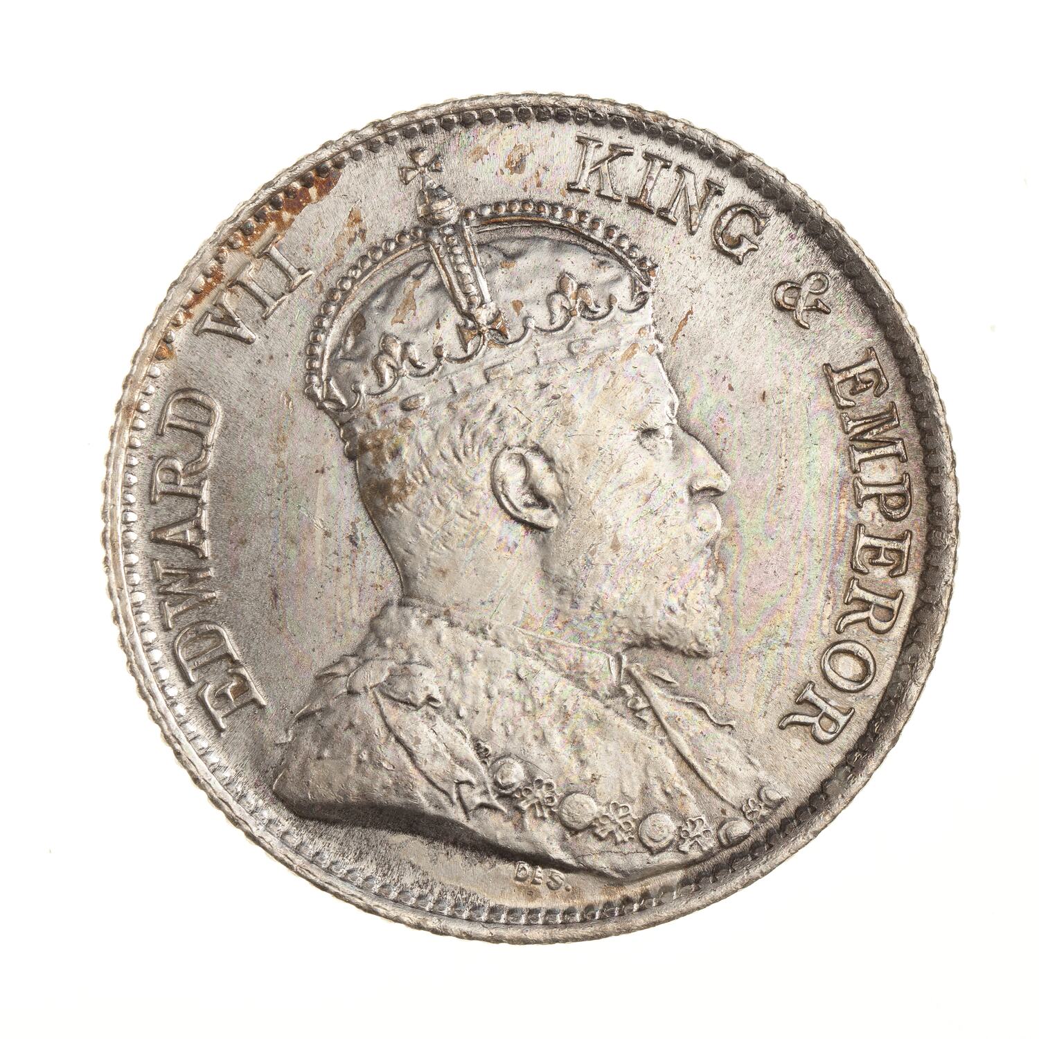 Crowned bust of the King facing left wearing an ermine robe, with the collar of the Garter; around, EDWARD VII KING & EMPEROR; artist's initials, DES, below bust
