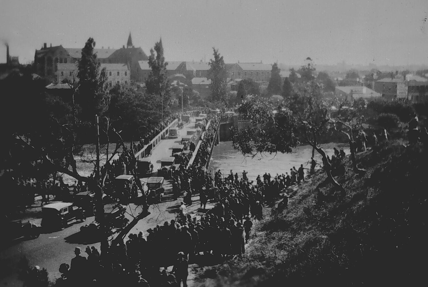 Crowds gathered by the Johnston Street Bridge to watch the Yarra River in flood. The river was at its peak of 59 feet (15 metres) the Convent of the Good Shepherd in Abbotsford is in the background.