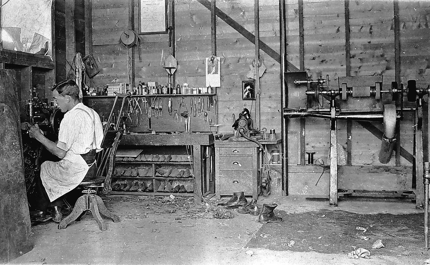 A boot and shoe repairer in his workshop. He had been a polio victim and his crutches are leaning against the wall.