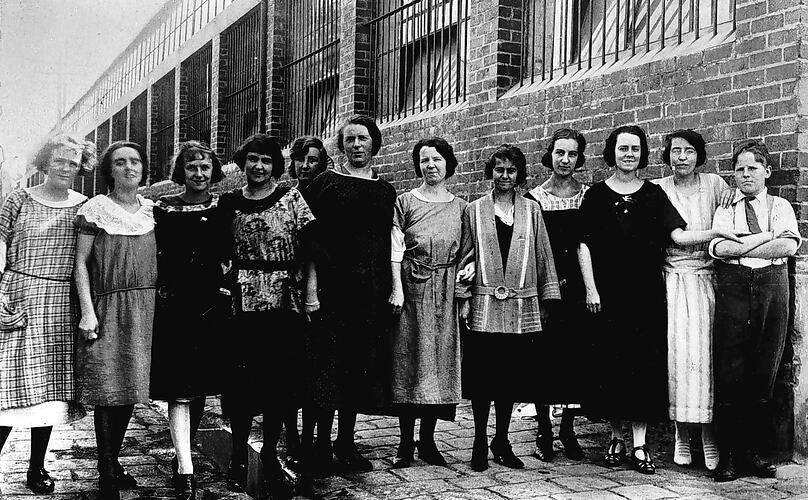 A group of women and a young boy outside the Gould & Porter Shoe Factory.