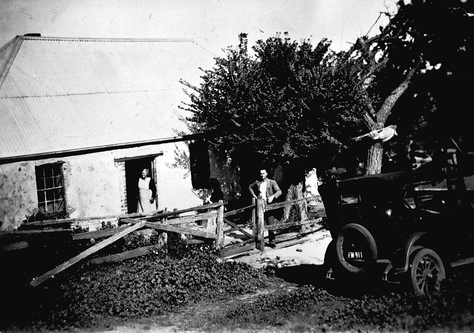 A women in the doorway of a farmhouse. The farmhouse had three rooms but had no water, power or toilet. A man is standing by the gate and there is a Chevrolet car parked in the road.