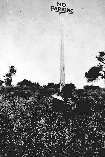 A couple kissing under a sign which reads 'No Parking'.