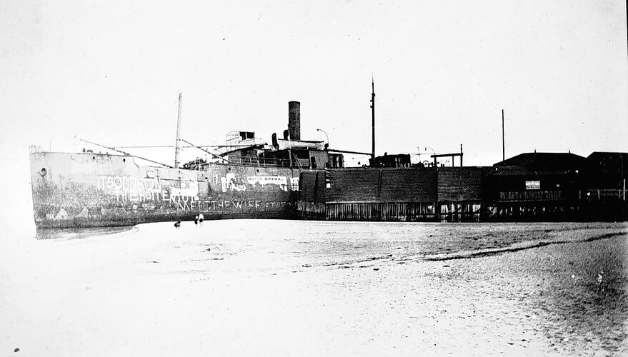 The 'Malaita' stranded next to the South Melbourne baths. The ship is covered with graffiti.