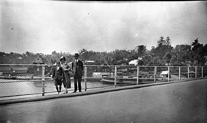 The Henshaw family pictured on a bridge at Lane Cove, a Sydney Harbour ferry in the background.