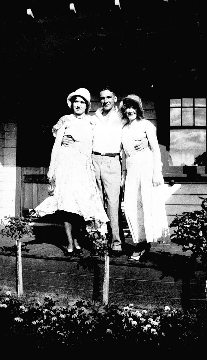 A man and two women on a front porch. There is a garden bed with rose bushes in front of them.