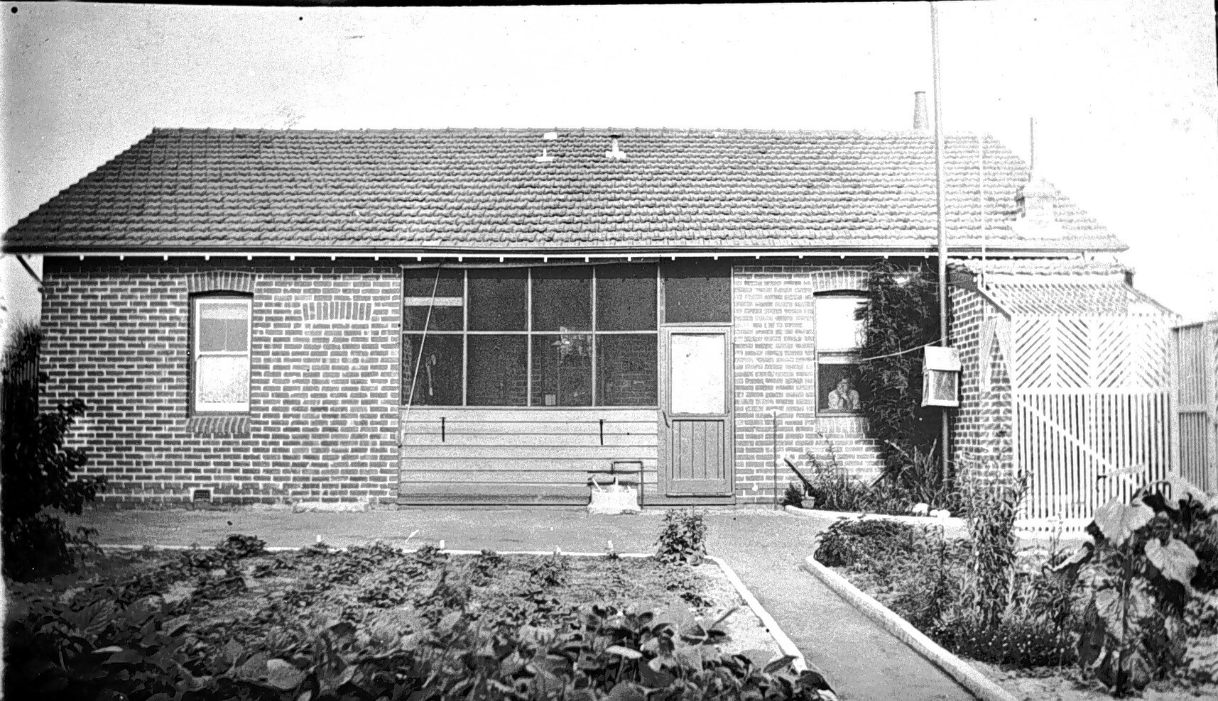 The house and back garden at 'Warrawee'. There are vegetables in the garden and a trellis on the right. A woman is looking through one of the windows.
