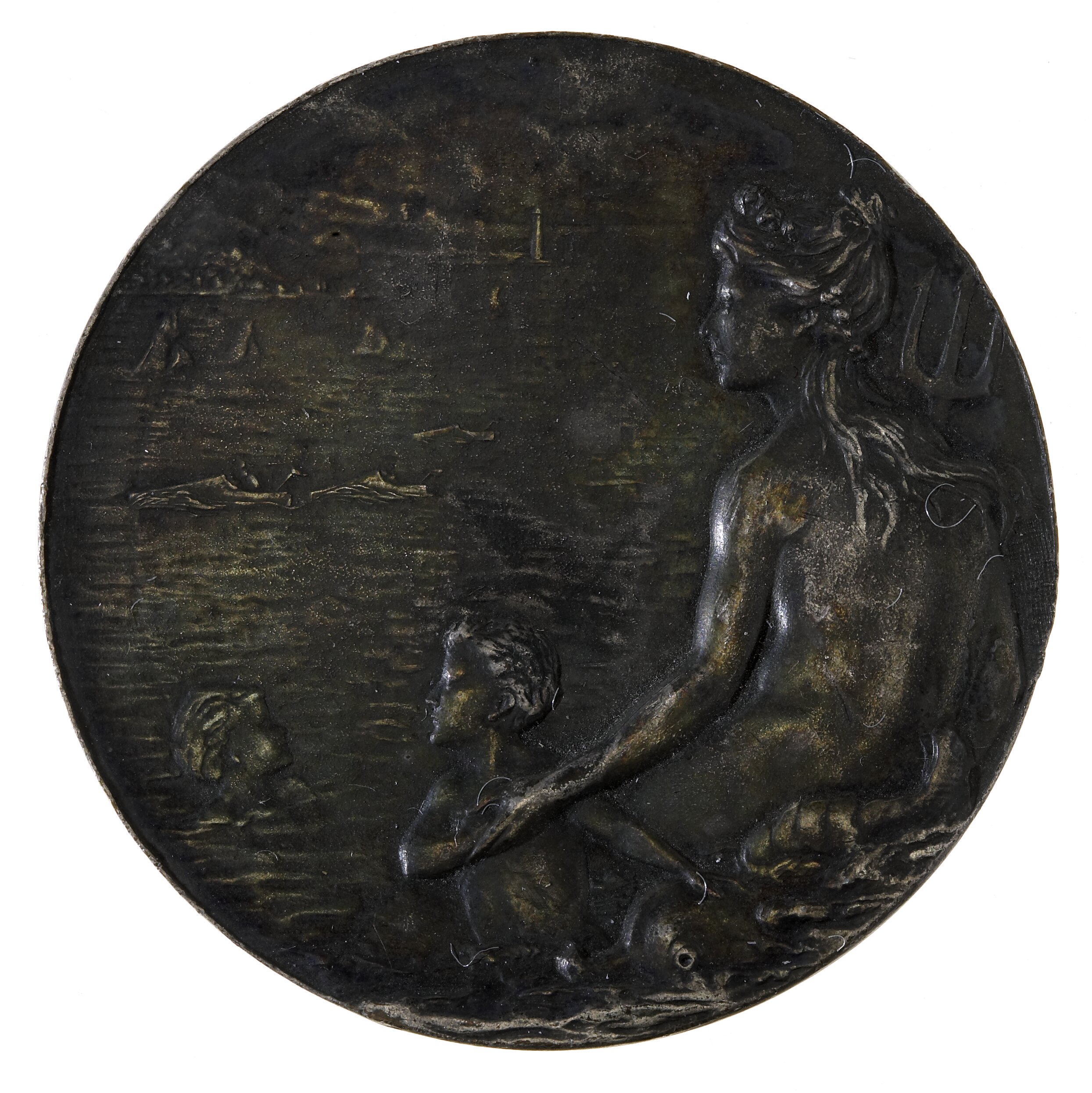 Female figure with trident holds a child in the water as another child floats nearby. Boats, lighthouse and land visible in background.