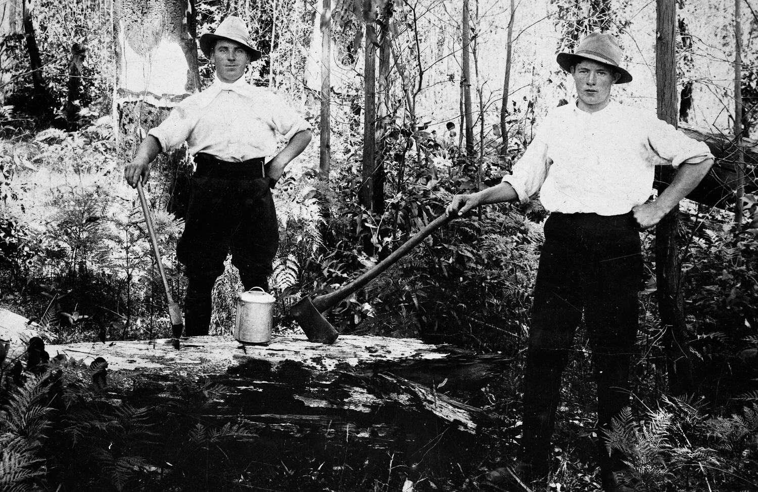 Two men with axes standing beside a tree stump. Their axes are driven into the top of the stump and there is a billy between them.