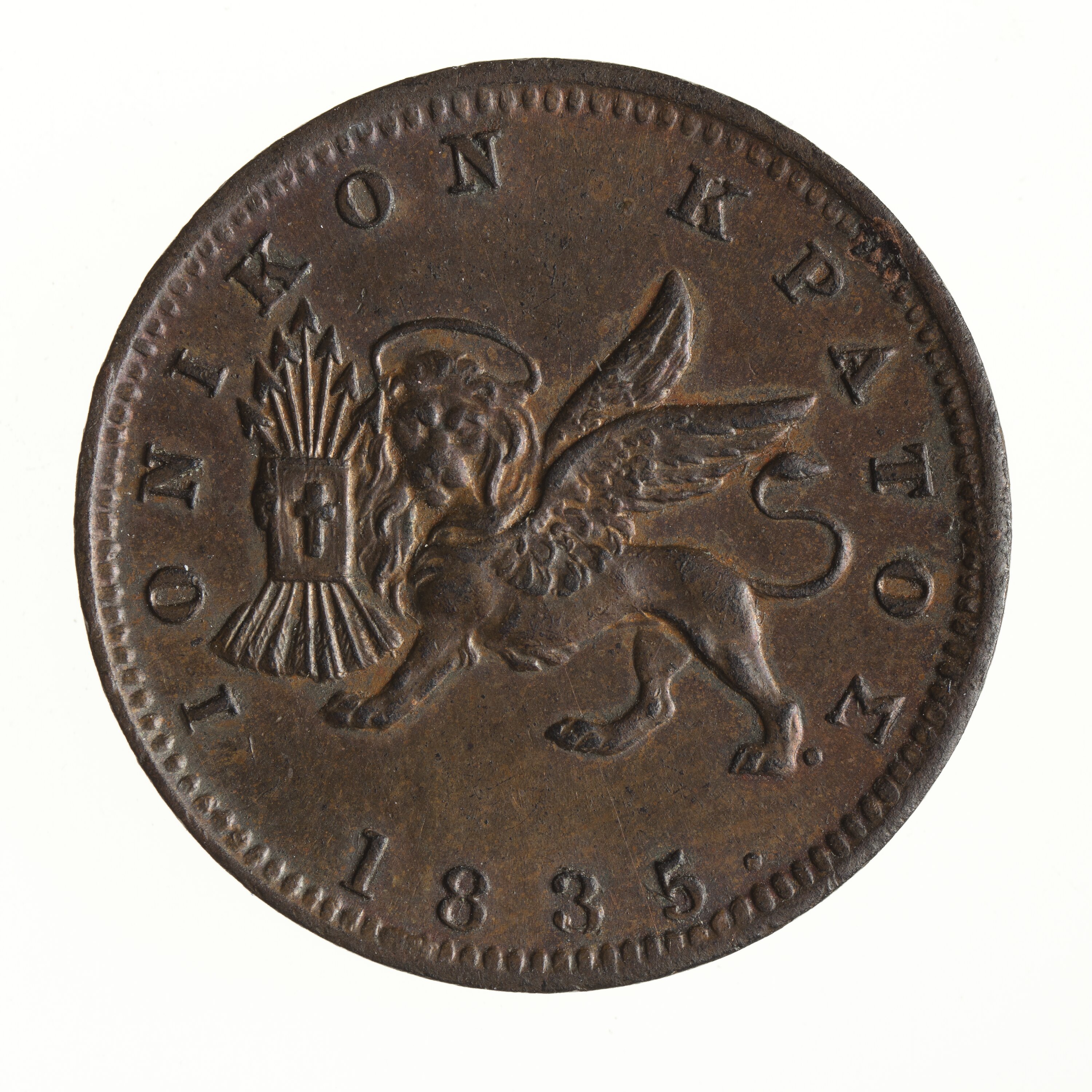 Winged lion of St. Mark facing to left holding Bible and seven arrows; below, 1835.; around above in Greek, IONIKON KPATOS