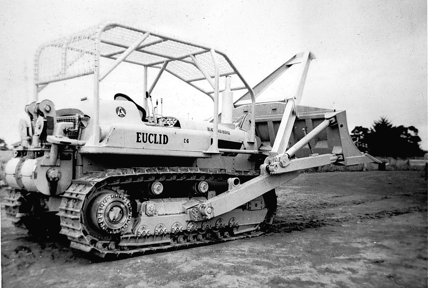 A Euclid tractor with an bulldozer attachment manufactured (or marketed?) by Errey Engineering.