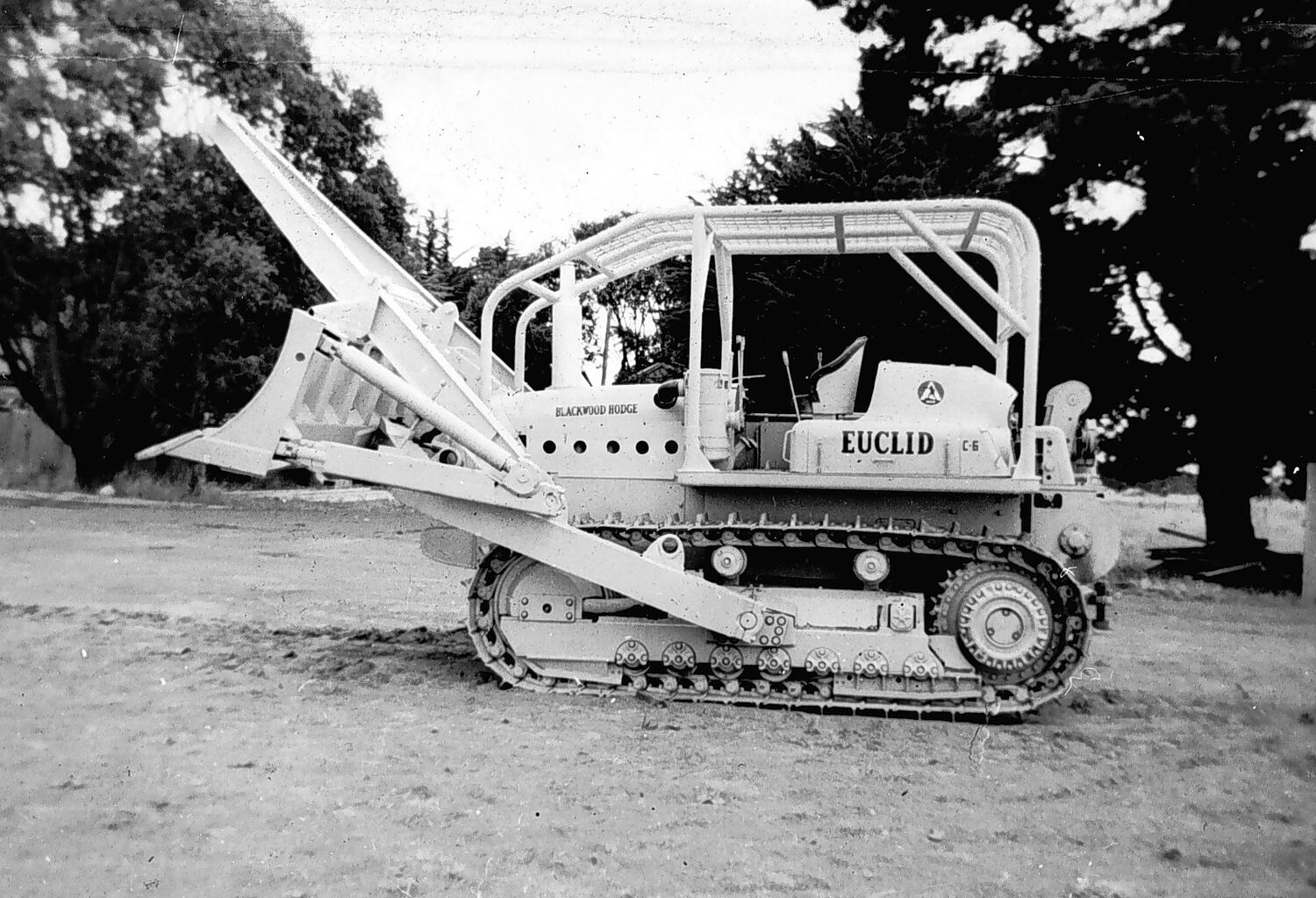 A Euclid tractor with an bulldozer attachment manufactured (or marketed?) by Errey Engineering.