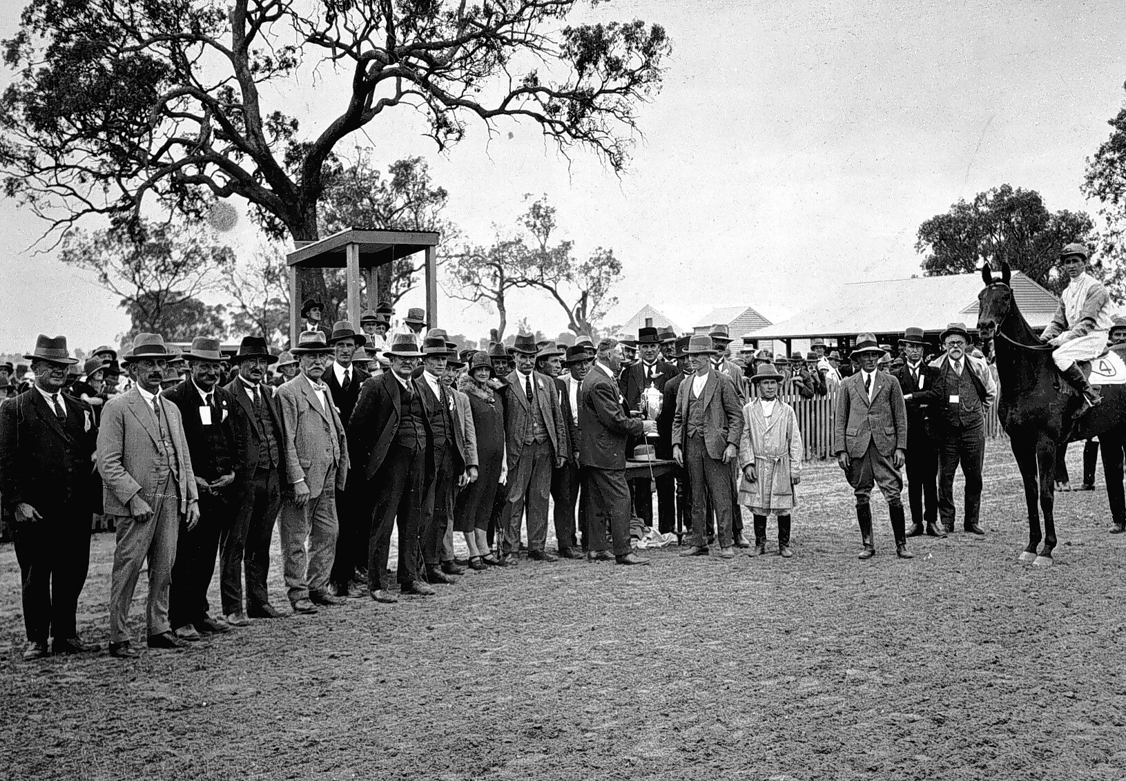 Racing at sheep hills. A trophy being presented to the winning owner. The jockey and winning horse are on the right.